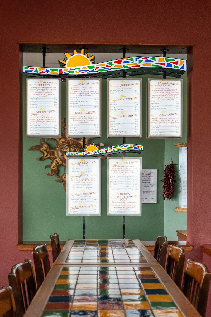 Fresh flour tortilla stuffed with, tomatillo rice, cheese, sauce, and beans. All smothered in your favorite sauce and topped with cheese. Served with lettuce & pico de gallo.